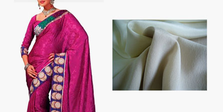 Crepe is a fabric of a gauzy texture, having a typically crimpy surface. While silk fiber is the popular choice, Crepe fabric is woven from natural or man-made fibers. Surface textures vary from fine, flat crepes to pebbled & mossy effects. Various print & dying techniques are employed on Crepe Sarees. Popular crepes include, Crepe de Chine & Georgette.